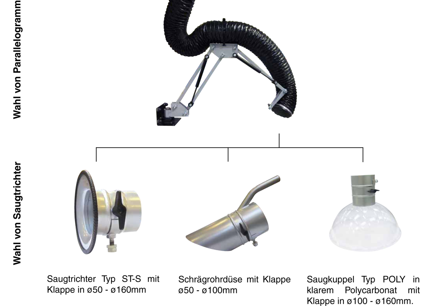 Combi-Arm zur Konfiguration von Absaugarm Typ RGF mit optioneller Aufhängungen und Saugtrichter. Das Aussen-Gestängesystem des Arms bedeutet minimaler Wartung. Der Schlauch Typ S10 ergibt optimierte Lebenszeit bei z.B. Schweissen.