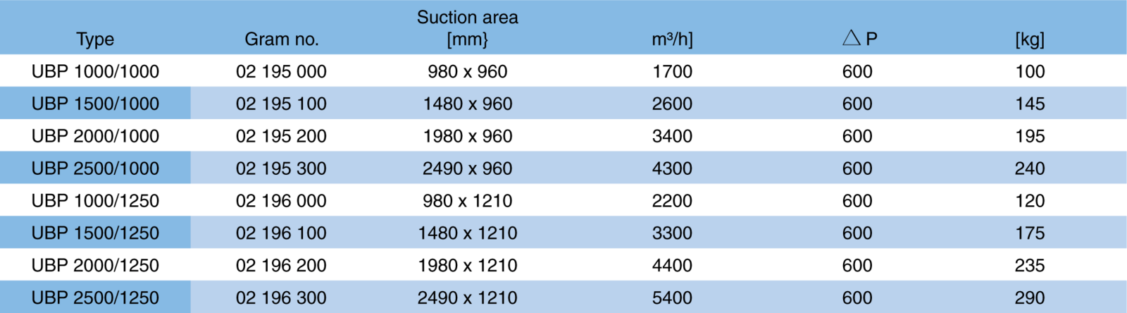 Process air is led in through table ribs and out through outlet at table end. The table is easily heigth-adjusted by leg brackets. Dust is collected in dust container in table bottom. Staff can move freely on 3 table sides. On the 4th the outlet is located.