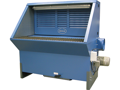 Universal extraction table with built-in filter cartridge and manual Roto-cleaning. Table top is standard made with wooden slats. Table top is also available with steel ribs, stainless steel ribs or plastic ribs (POM)