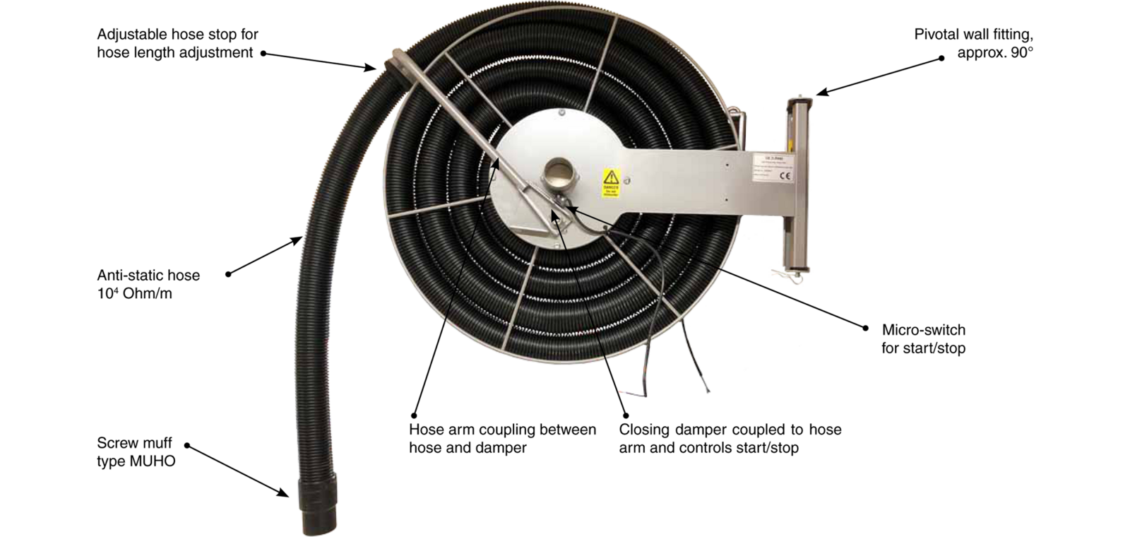 Hose hangs weight-relieved and does not come into contact with the floor. Hereby the total weight to be lifted is reduced and the hose life is extended as it does not wear to the floor.